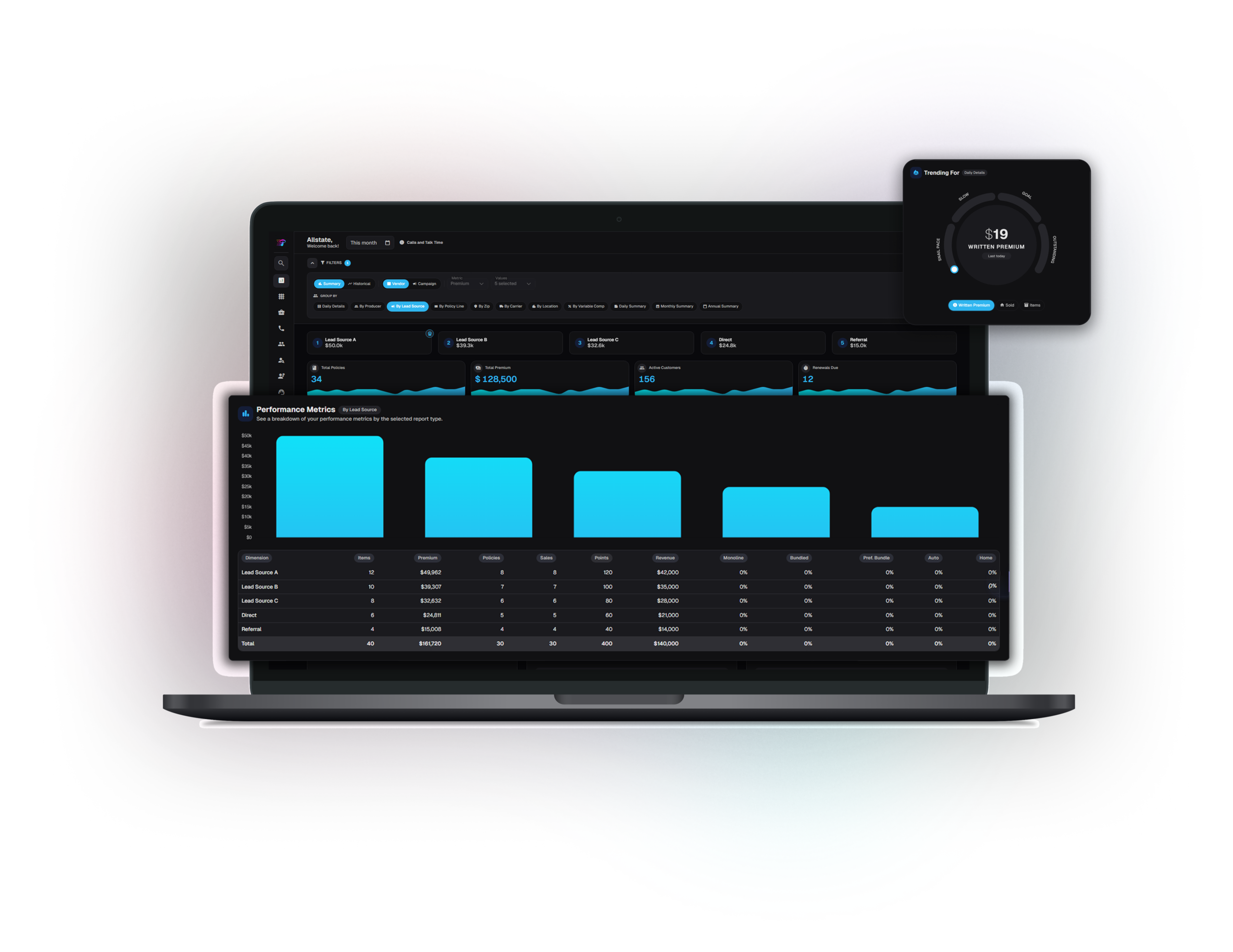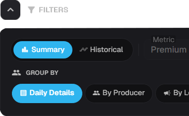The Agency Policy Dashboard brings premium sales, production, and mix into a single workspace: who’s leading, how the office is tracking to goals, and how performance splits across the ways you slice the business. The aim is to make reviews, coaching, and planning faster—everyone works from the same live view of agency outcomes.