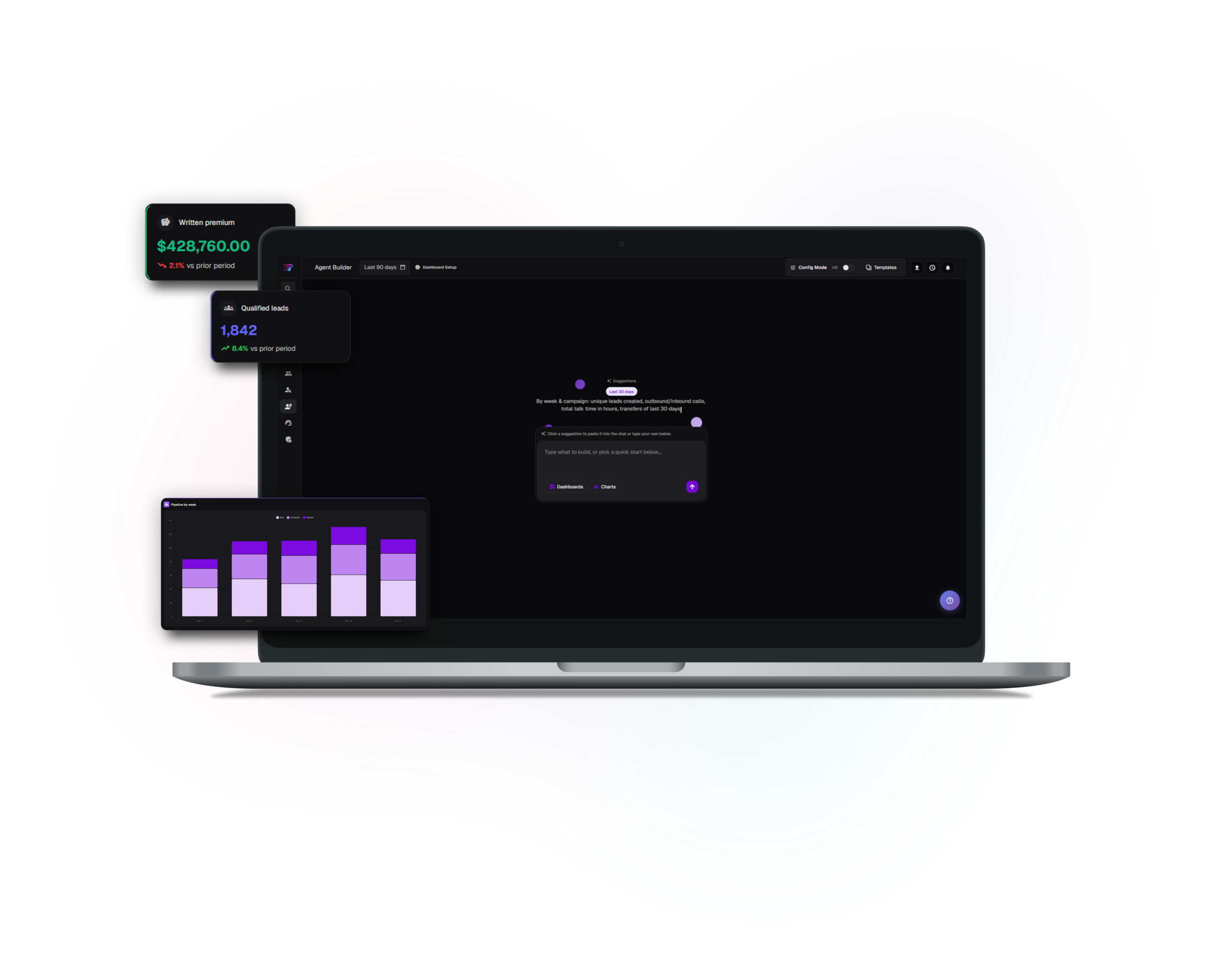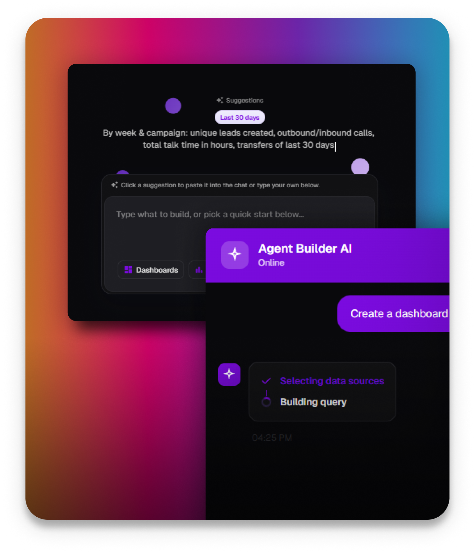 Talk to an AI assistant in plain language. It suggests cards and charts that match your needs and adds them to your dashboard so you can keep, adjust, or remove them in one place.