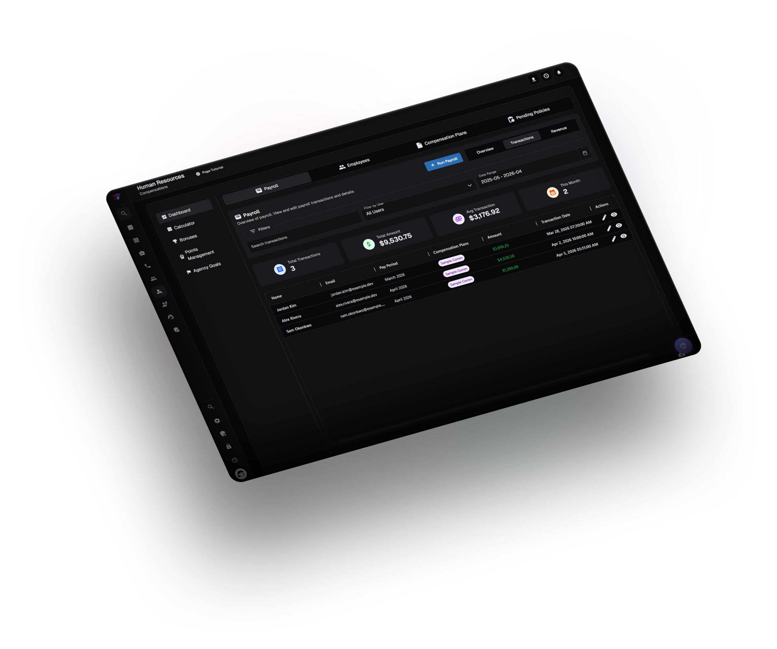 Start new pay runs, then move between an overview, detailed transactions, and revenue context—with filters and exports so finance can see what happened in the period without leaving Human Resources.