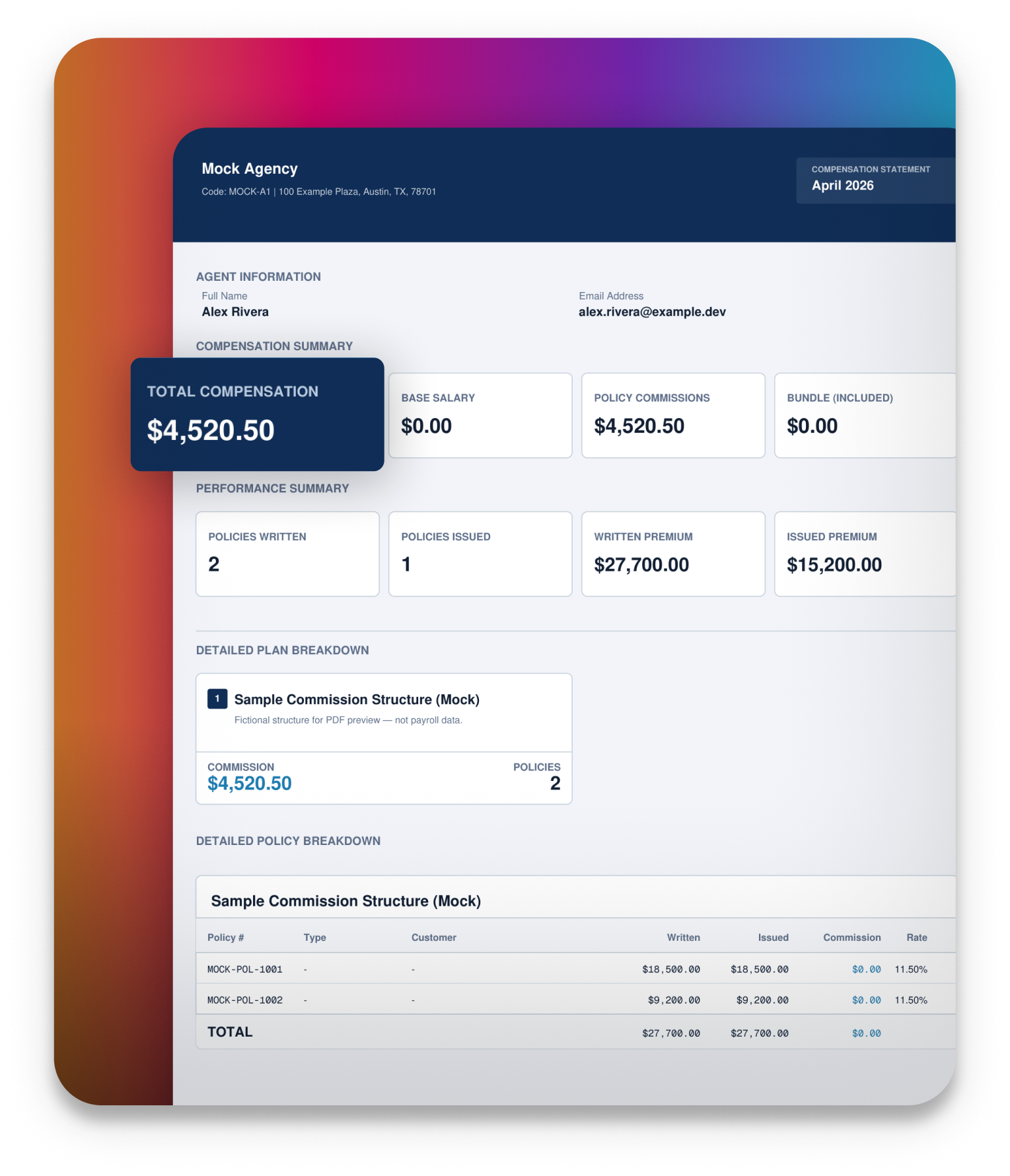 The main action starts a new pay run for the selected period and team. Where available, you can generate compensation statements as PDFs (for example, email them to agents) from the same run so payouts and documents stay in sync.