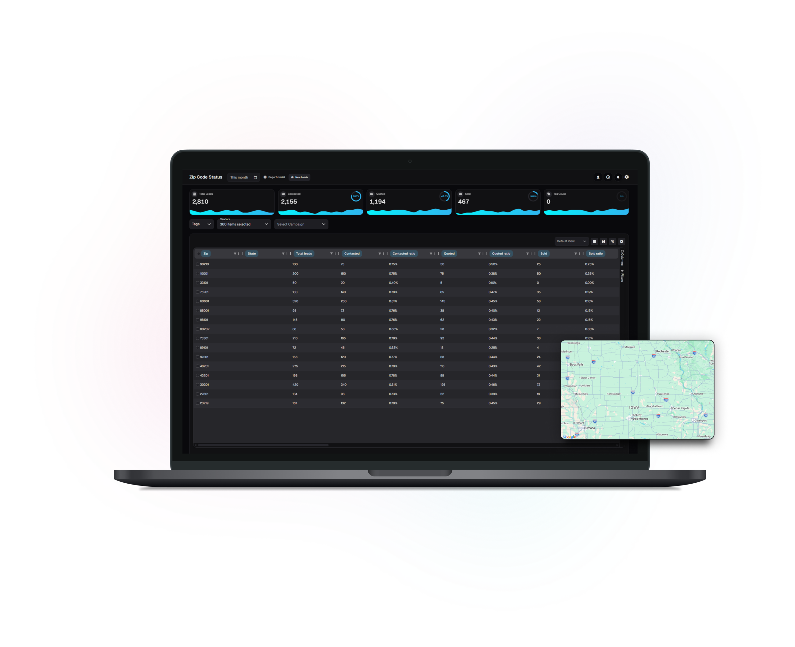 This page helps teams understand lead performance by location, showing not just volume but where demand concentrates, where conversion varies, and where follow-up may be uneven. Filters narrow the view to the regions and partners that matter. High-level summaries provide a quick read, while structured lists support sorting, comparison, and follow-through. When available, spatial context makes regional patterns easier to explain in reviews.